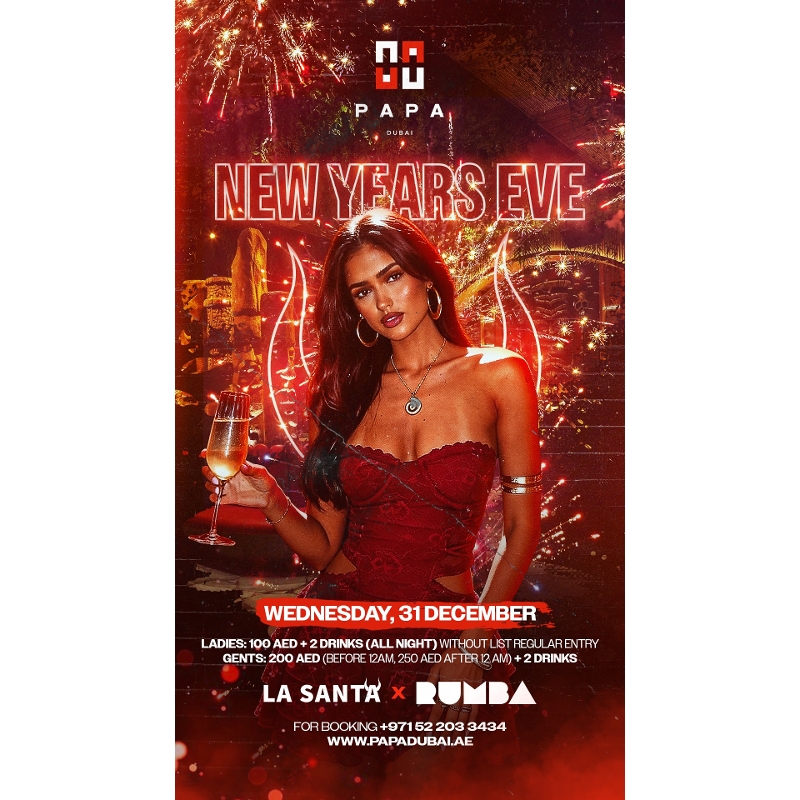 Come and join us to the wildest New year party in Dubai - LA SANTA x RUMBA at PAPA Dubai 🎇🔥 🗓 Wednesday - December 31, 2025 🕚 Doors open at 10:00 PM 🕴 GENTS SPECIAL: Before 12mn 200aed, 250ae after 12mn includes 2 Free House Drinks 📝 Terms & Conditions: TICKETS are NON REFUNDABLE Dress Code: Smart Casual ( shorts not allowed ) Must be 21+ to enter ( physical ID required )